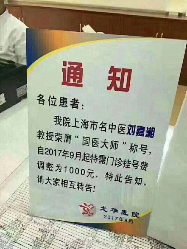 “各位患者:我院上海市名中醫劉嘉湘教授榮膺‘國醫大師’稱號,自2017年9月起特需門診掛號費調整為1000元,特此告知,請大家相互轉告!”近日,上海中醫藥大學附屬龍華醫院發布了這樣一則通知。
