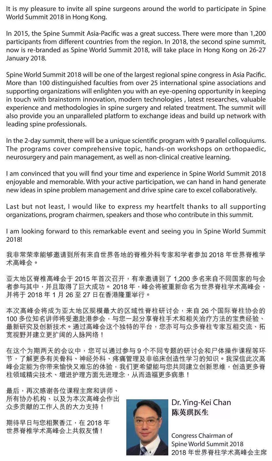 2018年,亞太脊柱峰會將重新命名為“世界脊柱學術高峰會(Spine World Summit)”,是亞太地區最大型的區域性脊柱峰會。