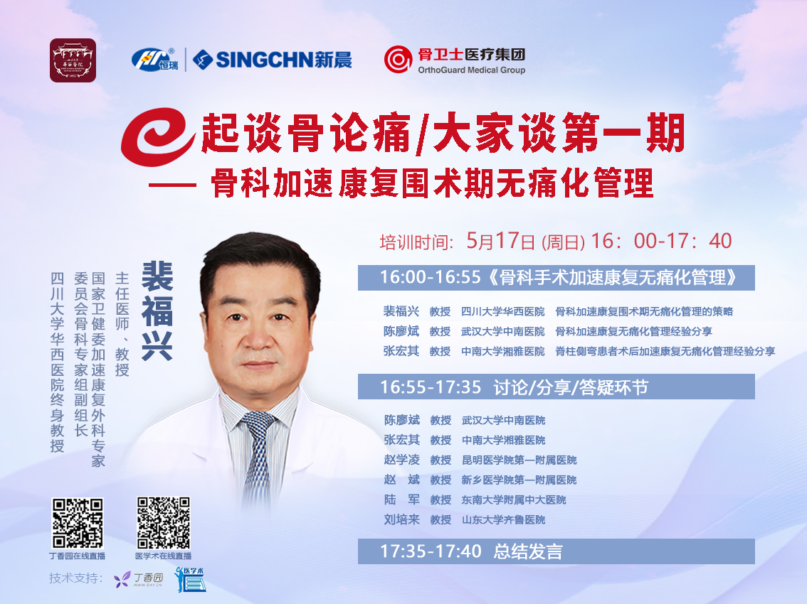 由四川大學華西醫院和江蘇新晨醫藥有限公司聯合主辦,骨衛士醫療集團承辦的《e起談骨論痛/大家談第一期——骨科加速康復圍術期無痛化管理》于5月17日(周日)16:00-17:40在丁香園和醫學術直播間上線。