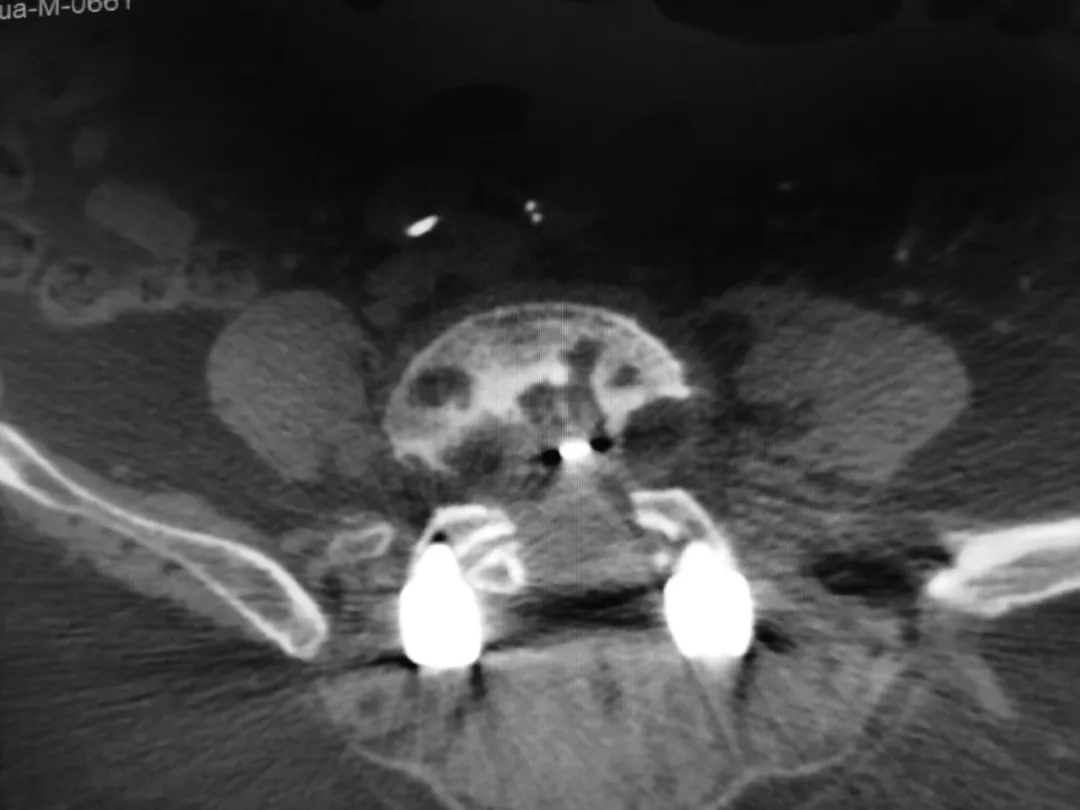腰椎內固定術后影像:CT可見椎體多個低密度灶。