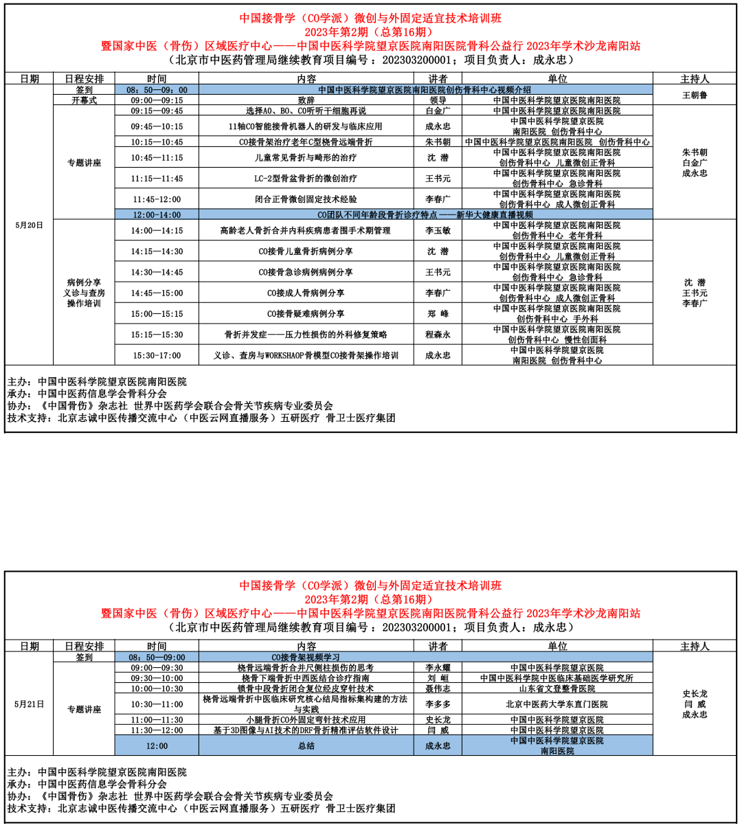 為持續推廣微創與外固定適宜技術,共享中國接骨學發展成果,2023年5月20日-5月21日,中國接骨學(CO 學派)微創與外固定適宜技術培訓班(2023年第2期,總第16期)暨國家中醫(骨傷)區域醫療中心——中國中醫科學院望京醫院南陽醫院骨科公益行2023年學術沙龍南陽站(北京市中醫藥管理局繼續教育項目編號:202303200001;項目負責人:成永忠)將以線上結合線下形式舉辦。
